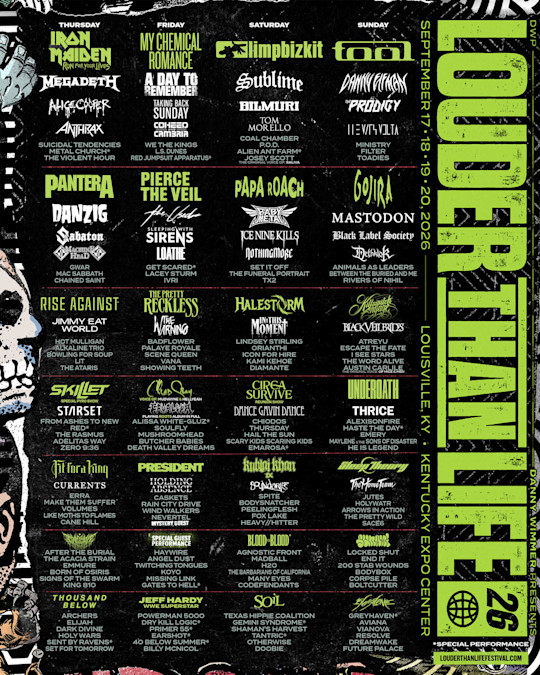 Louder Than Life has unveiled its 2026 lineup featuring nearly 200 artists, positioning the Louisville festival as one of the year's most significant media opportunities for music photographers and journalists. The four-day event, taking place September 17th through September 20th, will showcase headliners Iron Maiden, My Chemical Romance, Tool, and Limp Bizkit alongside an extensive roster of rock and metal acts.